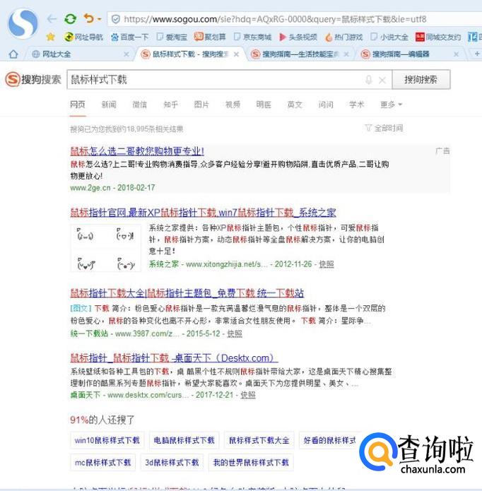我们需要的是一个自己喜欢的鼠标样式安装包,大家可以在各个网站进行搜索和下载。这里小编用的是搜狗浏览器,输入鼠标样式下载进行搜索。得到如下结果。