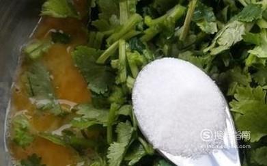 将香菜洗净后切成碎末,将鹅蛋打成蛋液,之后混合在一起。