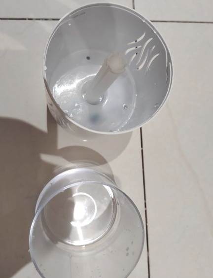 3、将加入水的容器与加湿器的上半部分安装好,一定要安装好,防止移动过程中发生里面水的漏出。