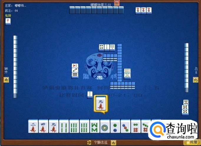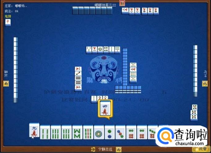 下家摸牌打八条,庄家摸牌打七条,顶家摸牌打四筒。本家摸牌,本家摸到了九条,正好和手里的九条组成一对。于是,本家打出九万。这样,本家就打缺万字这门牌了。如图所示。
