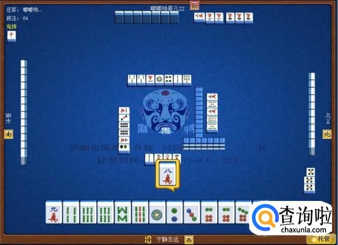 下家摸牌打三万,庄家摸牌打三条,顶家摸牌打二筒。本家摸牌,本家摸到了八万,本家打出八万。如图所示。