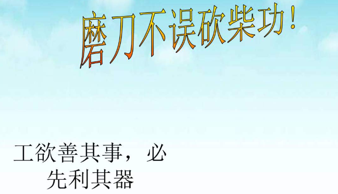 “磨刀不误砍柴工”这句话意思是磨刀花费时间,但不耽误砍柴。比喻事先充分做好准备,就能使工作加快。表面的意思是在刀很钝的情况下,严重影响砍柴的速度与效率,在砍柴前虽然费一些时间来磨刀,并不立即去砍柴,但一旦当刀磨得很快,砍柴的速度与效率会大大提高,砍同样的柴反而用时比钝刀少。