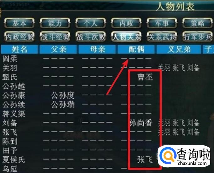 首先我们需要明确一下,要生出后代,一定要是有配偶的武将才有机会生出后代的,在游戏中的人物列表里,可以看出哪个武将当前有配偶。