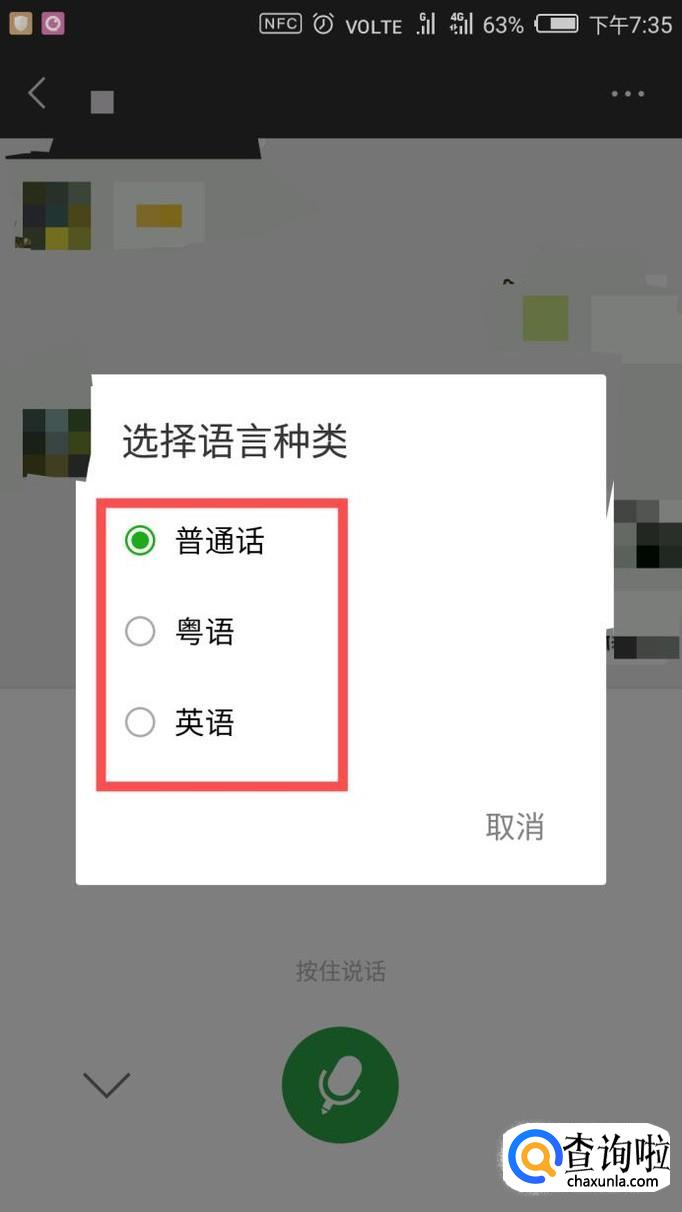 目前微信支持三种语言的语音输入,分别是普通话、粤语和英语,我们可以通过下面图片所示更改成相应的语言。