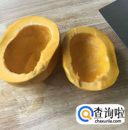 然后把板栗南瓜对半切开,然后把瓜瓤弄出来。