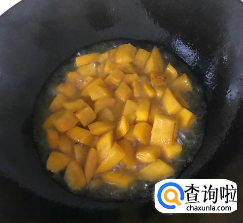 热上锅,然后倒入适量的油,油热之后把南瓜块放进去翻炒。
