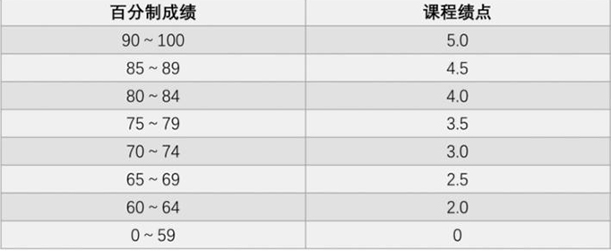 早在1999年起就开始采用GPA衡量学生学习质量,几年来这种方法已逐步被大家所理解、接受。平均学分绩点换算的方法为把各科成绩按绩点数乘以学分,再以总学分除之。分数成绩和绩点数的换算如下:90-100分=4.0;85-89分= 3.7;82-84分=3.3;78-81分=3.0;75-77分=2.7;72-74分=2.3;68-71分=2.0;64-67分=1.5;60-63分=1.0;60以下=0。如果一学期修了三门课,英文3学分(成绩4点)、历史3学分(成绩2点)物理3学分(成绩3点)。那么GPA是(4×3+3×2+3×3)÷9=3。