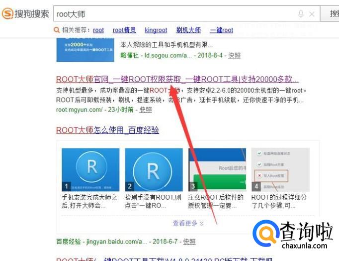 打开电脑,进入搜狗浏览器,搜索“root大师”,点击并进入,如图所示。