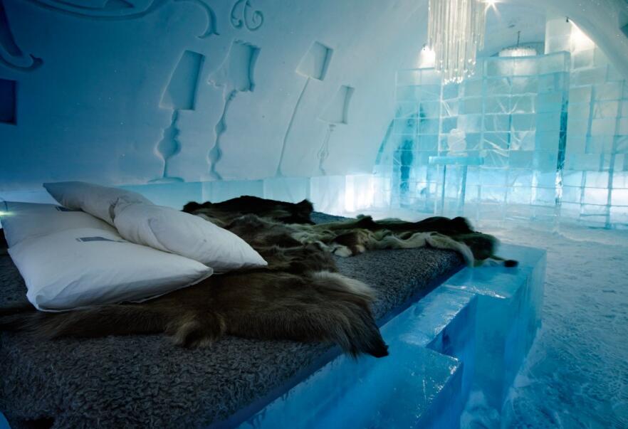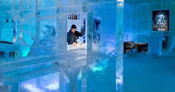 入住难以置信的冰旅馆后,一切都那么地令人惊异。双人房和套房、休息室、房间支柱、以及可点威士忌的著名冰酒吧均采用冰块作为主要建筑材料。每件物品都泛着浅蓝色的光,仿佛置身于冰河之中。
