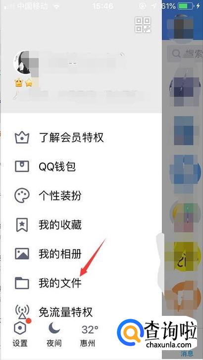 首先我们登录手机qq后点击左上角的头像进入到我的文件里面。