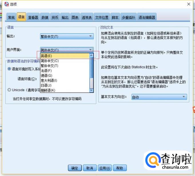将“用户界面”选项用语言修改为“英语(E)”即可