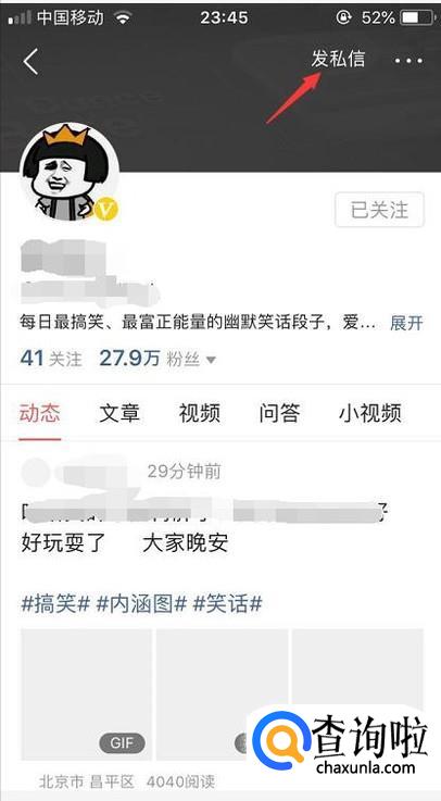 在关注的人里面找到你想要私信的人,点开他的个人页面然后点击右上角的私信功能。