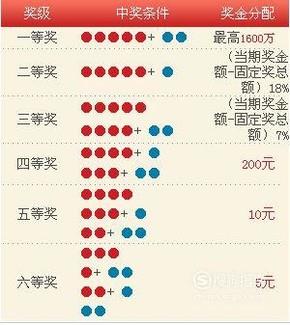 六等奖(5元):任意3个前区号码,或任意1个前区号码+2个后区号码或任意2个前区号码+1个后区号码相同或2个后区号码相同。