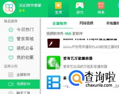 我们可以通过360软件管家来下载,这样不会有捆绑软件。打开360软件管家,点击上面的“宝库”,在左边出现的软件分类里点击“视频软件”。