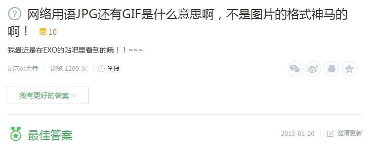 注意这个2013年的百度知道提问,提问者明确强调了他问的是作为网络用语的含义,而不再是图片格式。所以这种用法大致诞生并流行开来的时间段就是2011年-2013年左右。