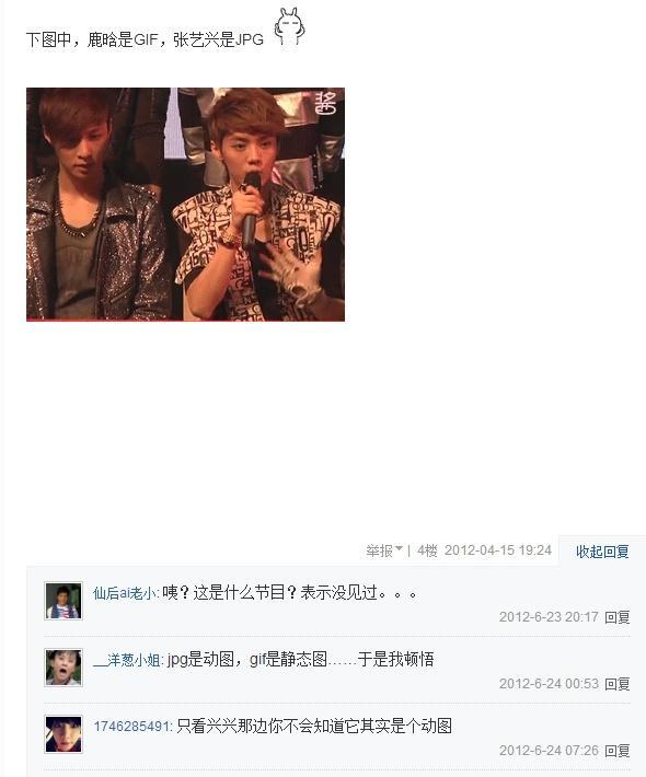 图中关于张艺兴的帖子的内容是描述一张动图,旁边的鹿晗一直在说话,而张艺兴在那个片段里几乎纹丝不动。所以楼主想到了用jpg来形容张艺兴,gif来形容鹿晗。从底下的回复也可以看出来这种描述在当时还是让人觉得新奇有趣的——其前提有两点,一是大家已经对于这两种图片格式所代表的含义十分熟悉(当然图中楼下那个回复说反了);二是这种描述还没有发展到成为一种泛用梗的程度。