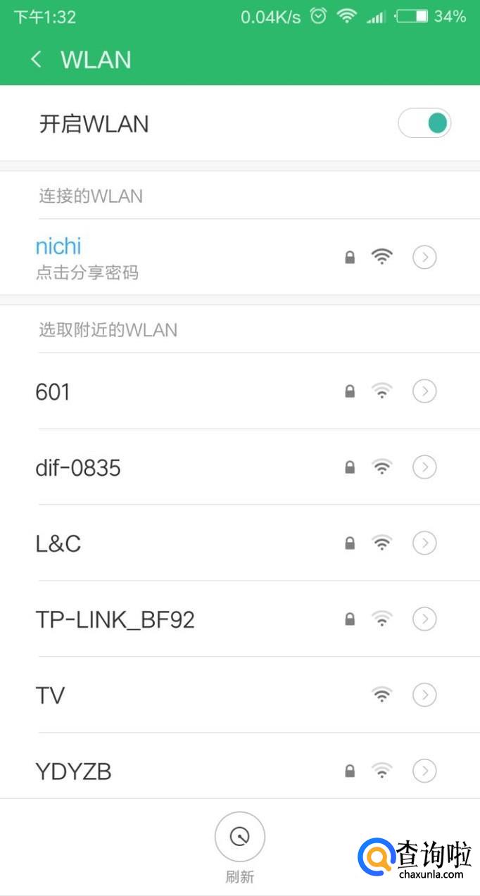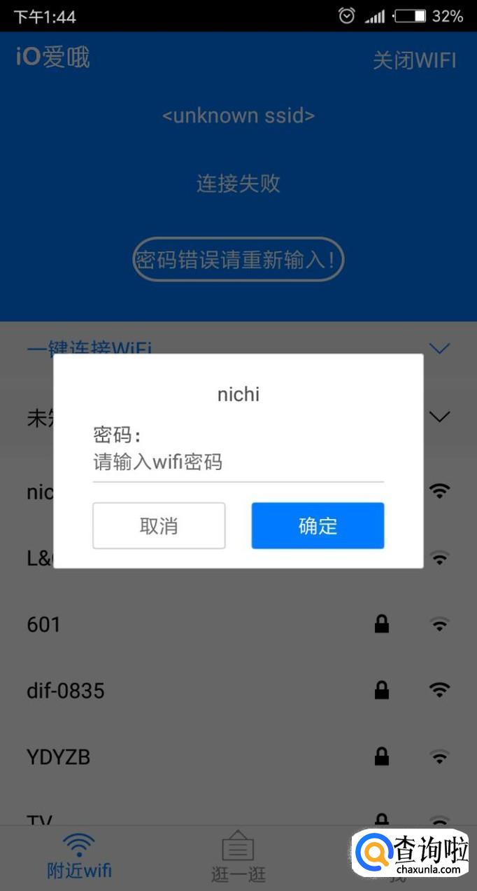 不做任何设置,打开爱哦客户端,打开【附近WiFi】页面,并点击刚才删除的WiFi名称。(比如点击nichi)