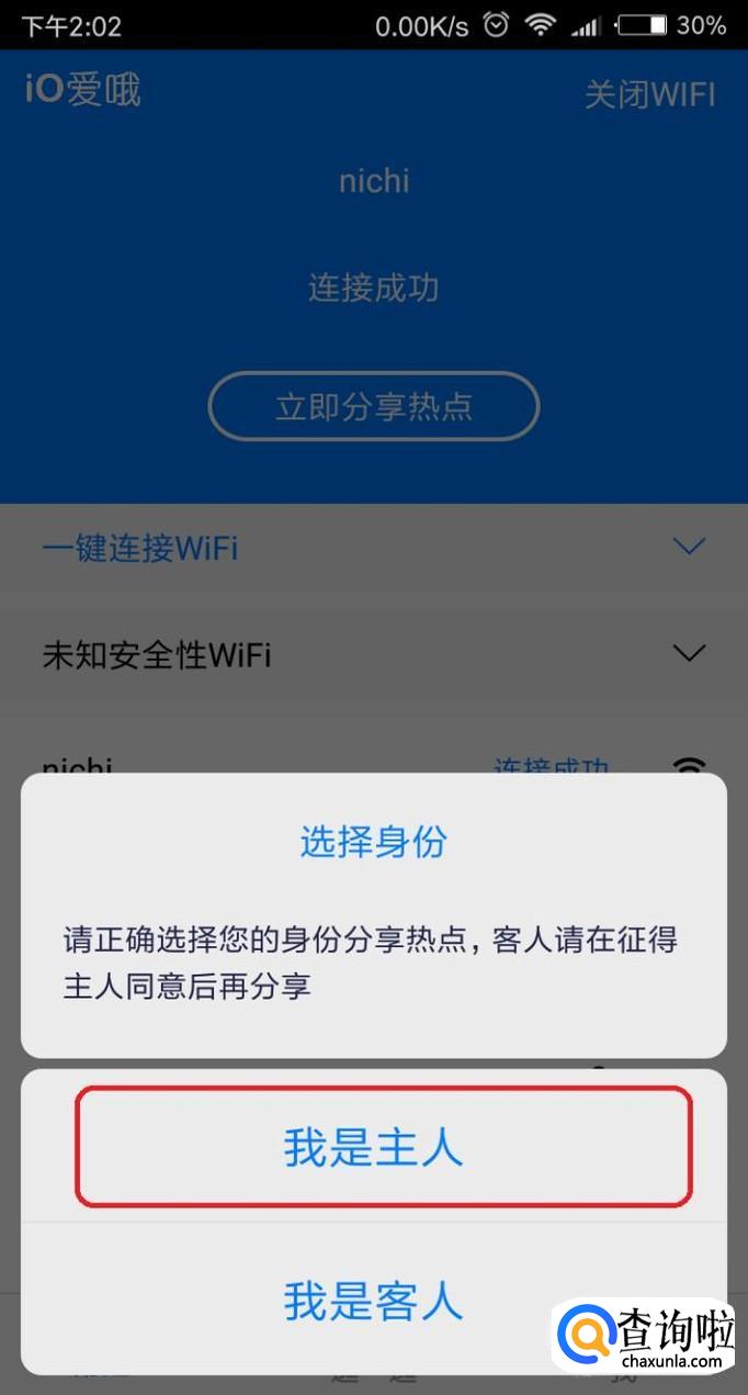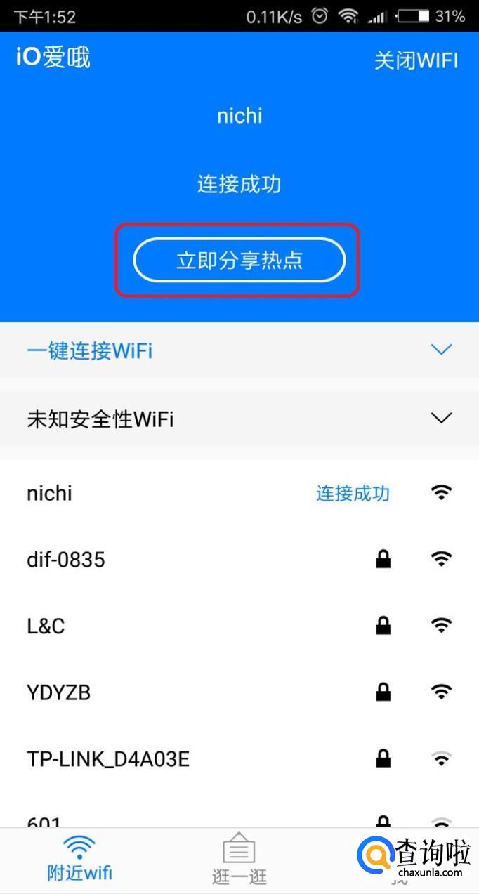 连接自己的WiFi成功后(如连接nichi成功了)点击【附近WiFi】页面的【立即分享热点】。