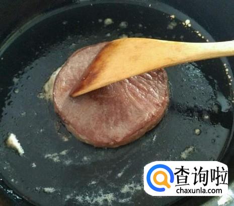 黄油热化之后,将牛排放入锅里面,正反面各煎制五分钟,如图所示。