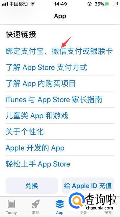 打开appstore后点击到app的页面然后一直拉到最后,从快速链接里进入到绑定支付宝、微信支付或银联卡。