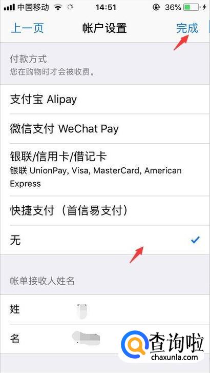 最后我们在账户设置里面把支付方式设置为“无”,然后点击左上角的完成即可。