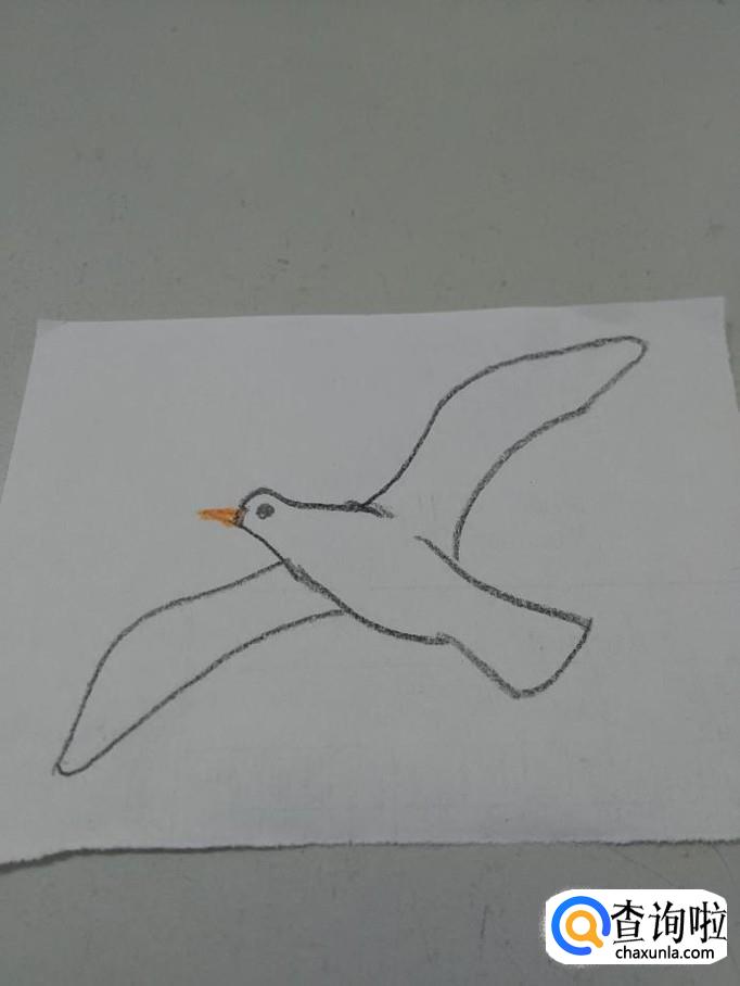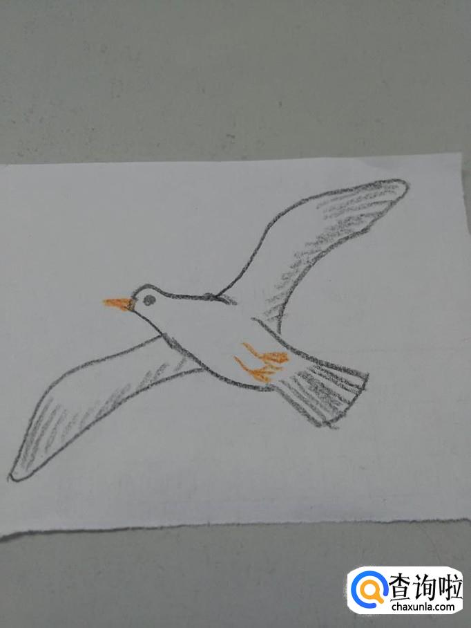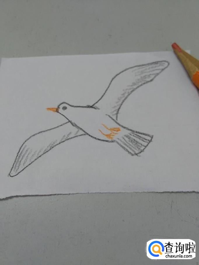 最后,用桔色笔在海鸥身体上画两条向后伸的腿,鸟儿在飞翔的时候,爪子都是倦缩起来的。用一条线表示腿,用三条短线表示爪子,到这里,海鸥就画完了。