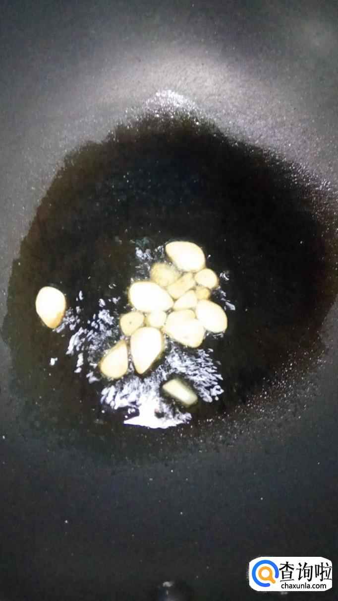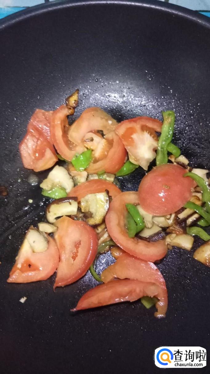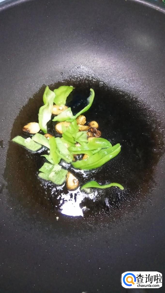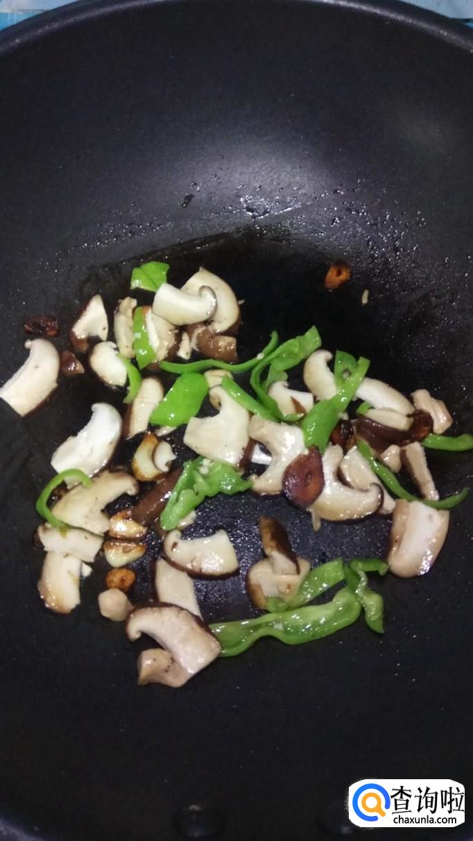 炒锅中放入适量油,油热后放入蒜片爆香,再放入适量青椒丝翻炒,然后加入切好的香菇翻炒均匀。