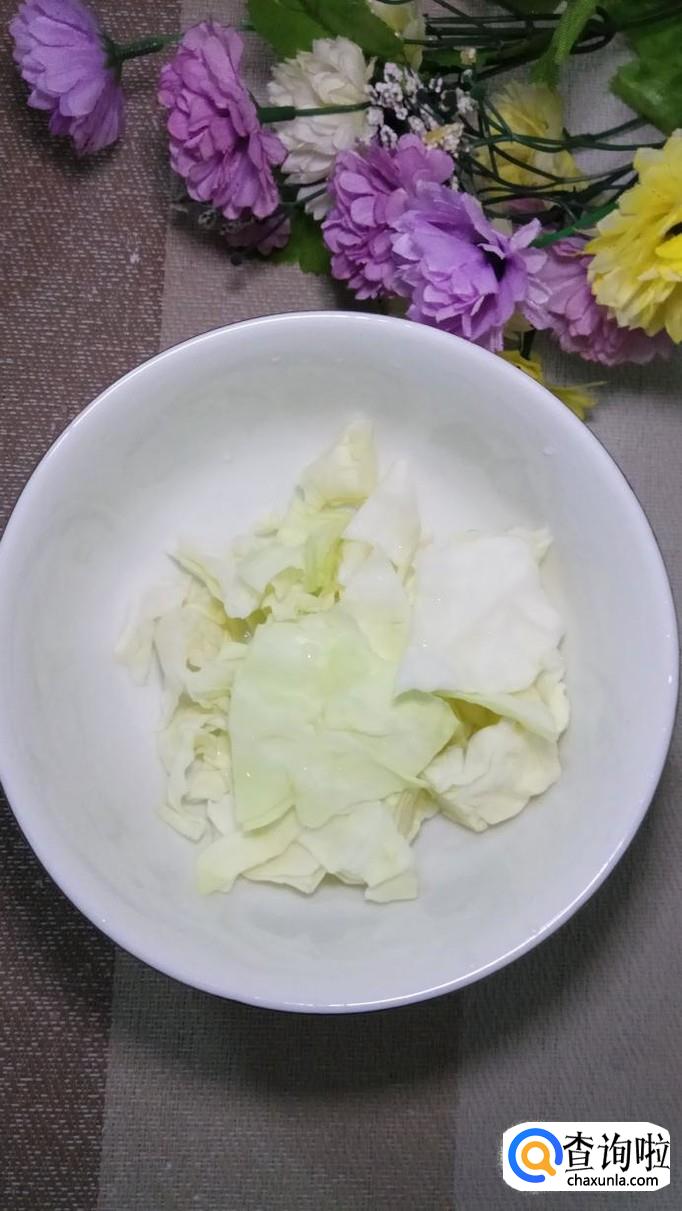 再准备适量包菜,洗净后撕成碎片,放入锅中。