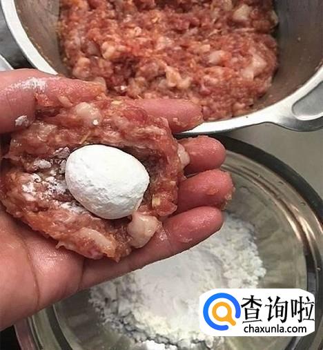 将鹌鹑蛋裹上淀粉再裹上肉丸,揉捏成圆球状。揉捏好的肉丸留着备用。