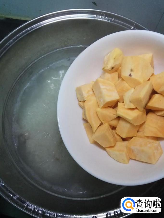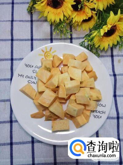 准备适量红薯,洗净去皮后,切成小块,放在盆中备用。