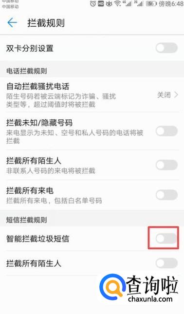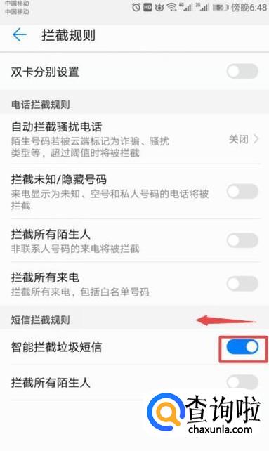 弹出的界面,我们将智能拦截垃圾短信的开关向左滑动关闭,这样我们就取消了短信拦截了。