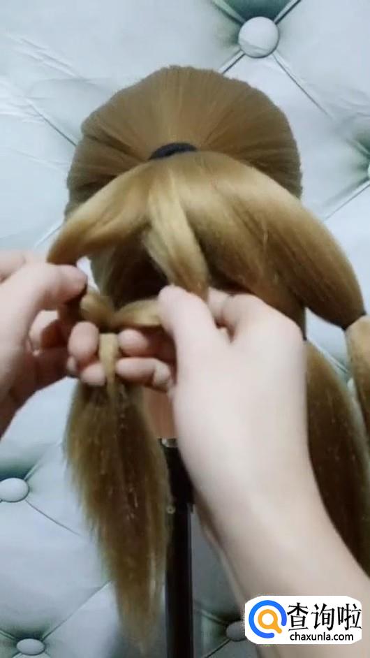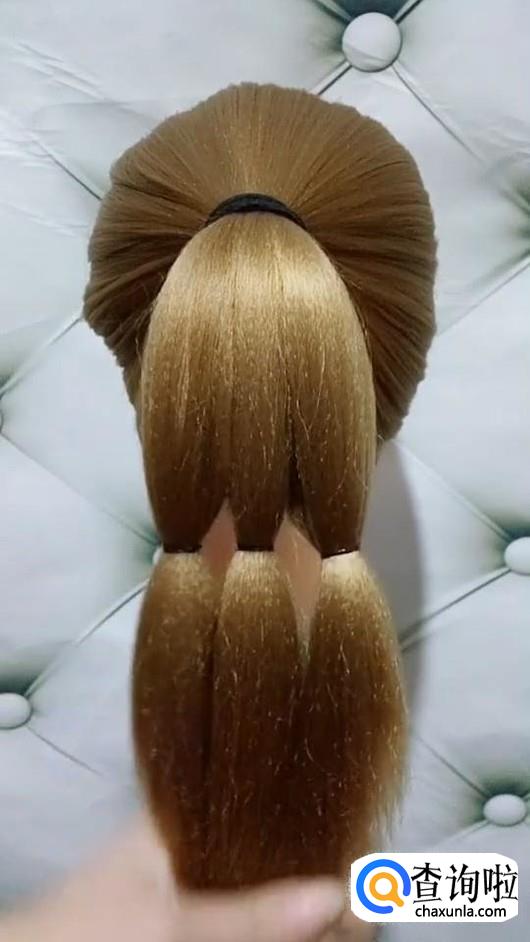 将马尾辫分成三股,在辫子的中间位置扎成三个小辫子。