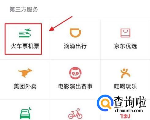如果手机里没有安装微信APP,那就打开支付宝APP,在首页点击“更多”,然后同样在第三方服务中能够看见“火车票机票”服务入口...