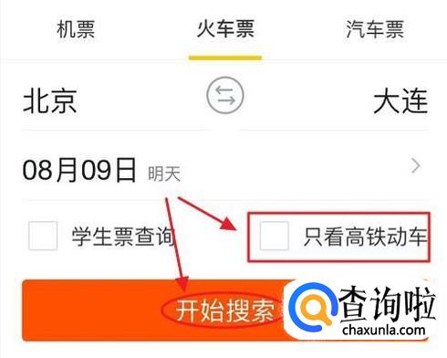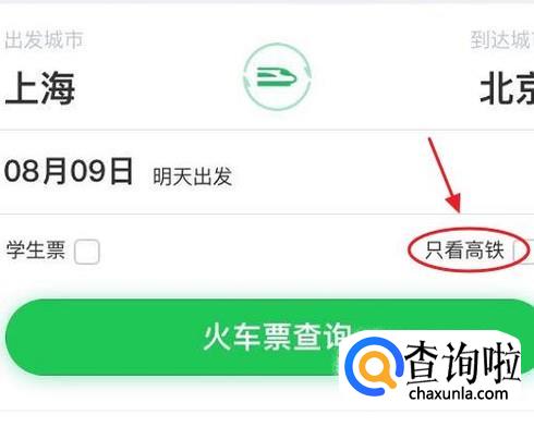 然后我们选择好出发地和目的地,还可以直接选择“只看高铁”,这样就能将那些普通列火车排除掉,省去了不少查找时间,如图一;