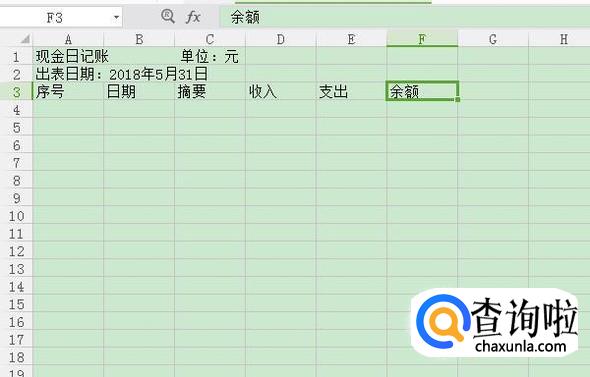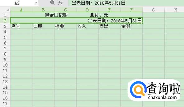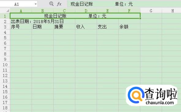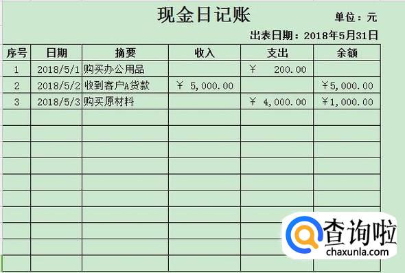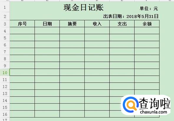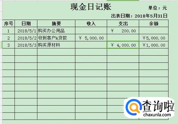 打开一个空白的Excel工作簿,将表格名称命名为月份,例如五月。在第一个单元格输入“现金日记账”和 “单位:元”,两者之间有空格。第二行输入 “出表日期:XXXX年XX月XX日”。在第三行分别输入“序号”、“日期”、“摘要”、“收入”、“支出”和“余额”。