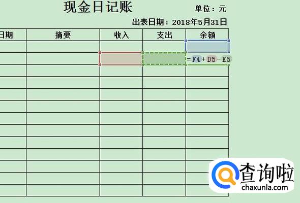 在单元格F5中,输入公式“=F4+D5-E5”。