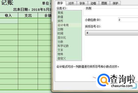 接着,选中“收入”、“支出”和“余额”这三列,将单元格格式设置为“会计专用”,并点击确定,如图所示。