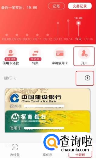 安装好后打开它,然后点击右下角的“卡管理”去绑定一张有“闪付”标志的银联卡,第一次使用的话需要点击下面的“开户”和绑定银行卡,绑定银行卡的方法是点击右方的“+”号,如下图所示。