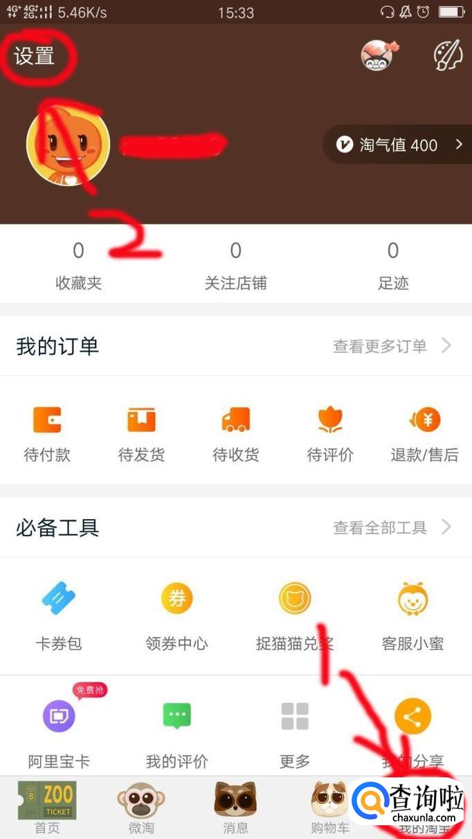 打开淘宝→点击首页“我的淘宝”→点击“我的淘宝”页面左上角“设置”