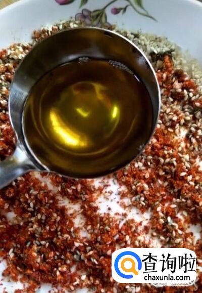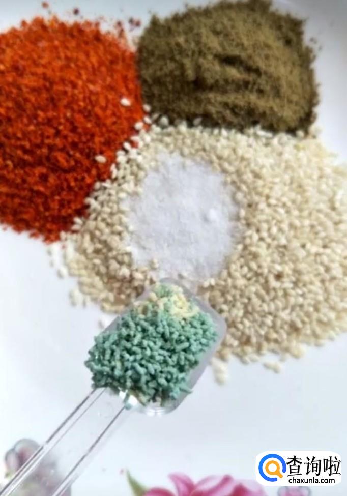 然后我们在盘中放入适量的辣椒面,孜然粉,芝麻,再加入适量的盐,鸡精,白糖调味