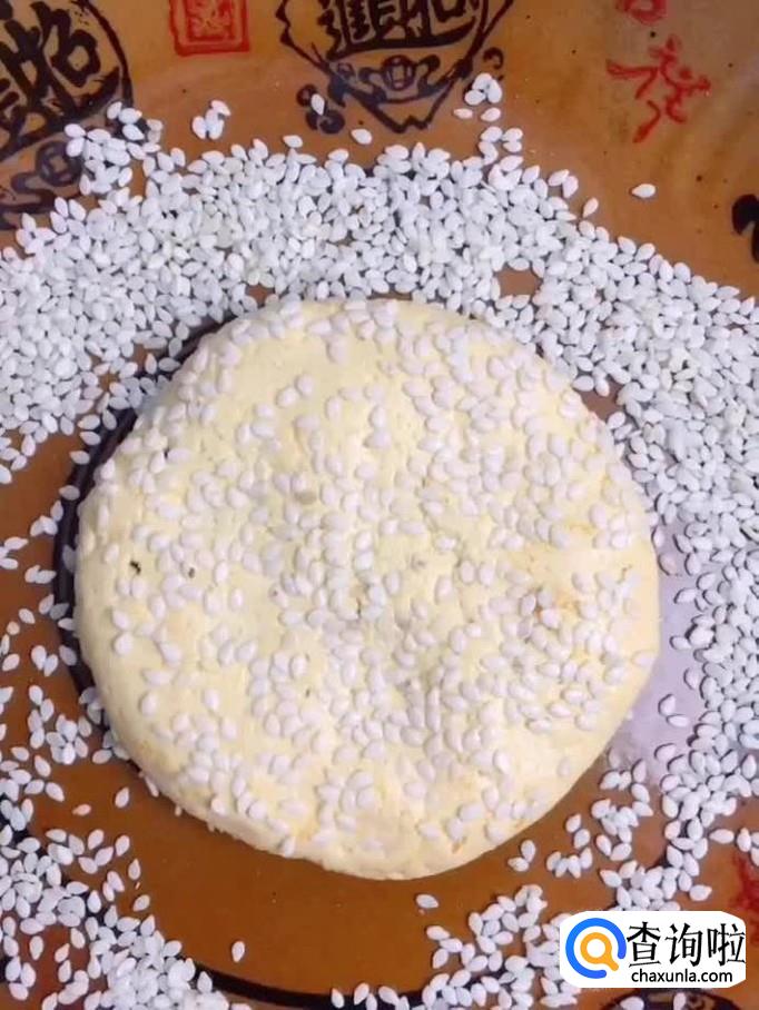 然后在一个碗中放入30克的白芝麻,把做好的南瓜饼放进去两面都沾上芝麻,如下图所示。