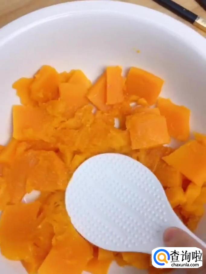 首先将南瓜去皮,切成薄片,上锅蒸十分钟,拿出来用盛饭的铲子按压成南瓜泥,如下图所示。小贴士:大家在切南瓜的时候最好切得越薄越好,这样方便南瓜蒸熟。