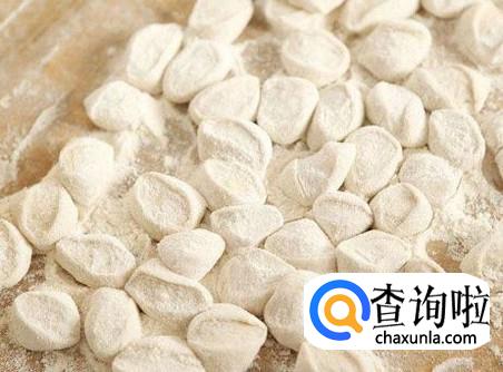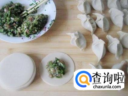 和好肉馅后,面也醒好了,在面板上撒上面粉,然后将面团放在板子上,再揉一会,使面团更有韧性,然后搓成长圆条,用刀切成一寸大小的块,用擀面杖擀成圆圆的扁片,将适量的肉馅放在面皮中间,把面皮对折,用手将面皮的边捏紧,一个个饺子就捏好了。