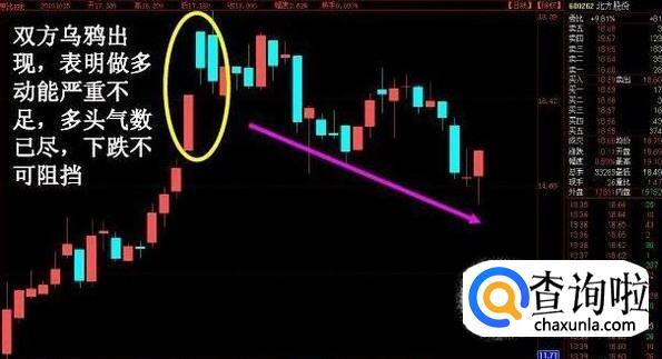 双头黑乌鸦,个股在经过大幅上扬之后,在相对的高位出现两条阴线,预示着上涨动能不足,有可能会出现下跌行情。