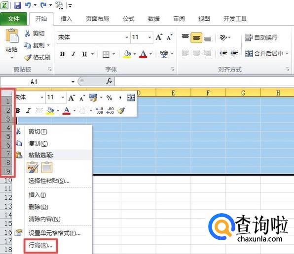 我们点击图示中的位置,选中一些行,然后右击选择行高;