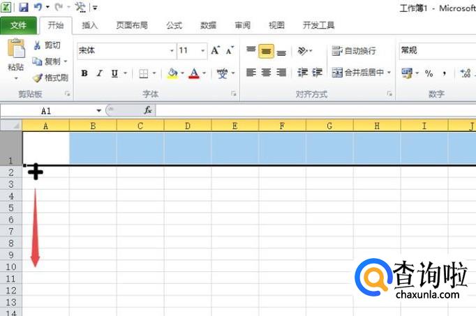 然后我们选中第一行,当第一行与第二行之间出现十字符号的时候,我们下拉界面;