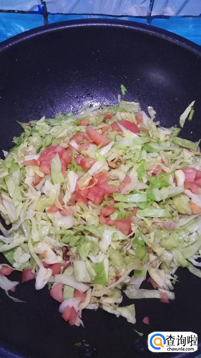 将准备好的西红柿丁儿倒入锅中,和包菜一起翻炒。