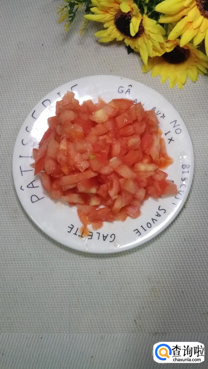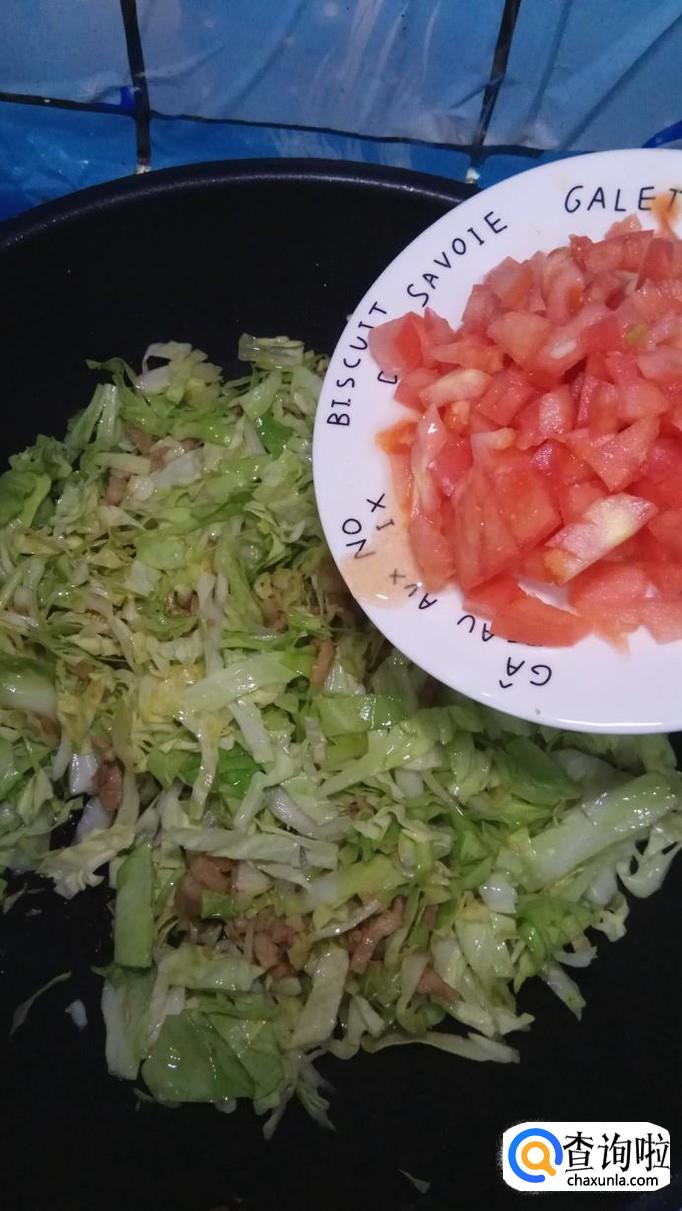将五花肉洗净后,切成丝,再将包菜也切成丝,西红柿切成丁,西红柿的量可以稍微多一些。