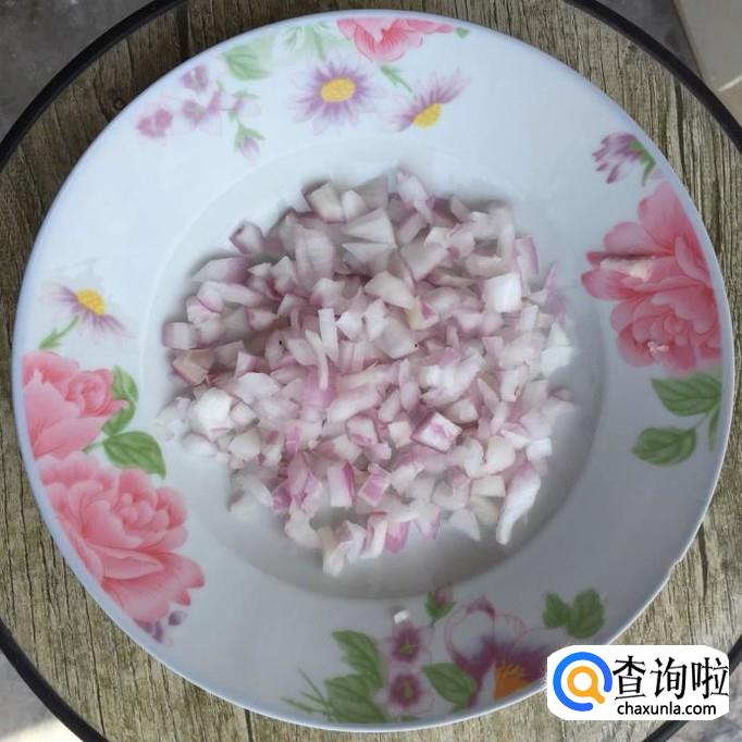 取一小块洋葱,将洋葱的外膜去掉,洗净,再切成碎丁状;