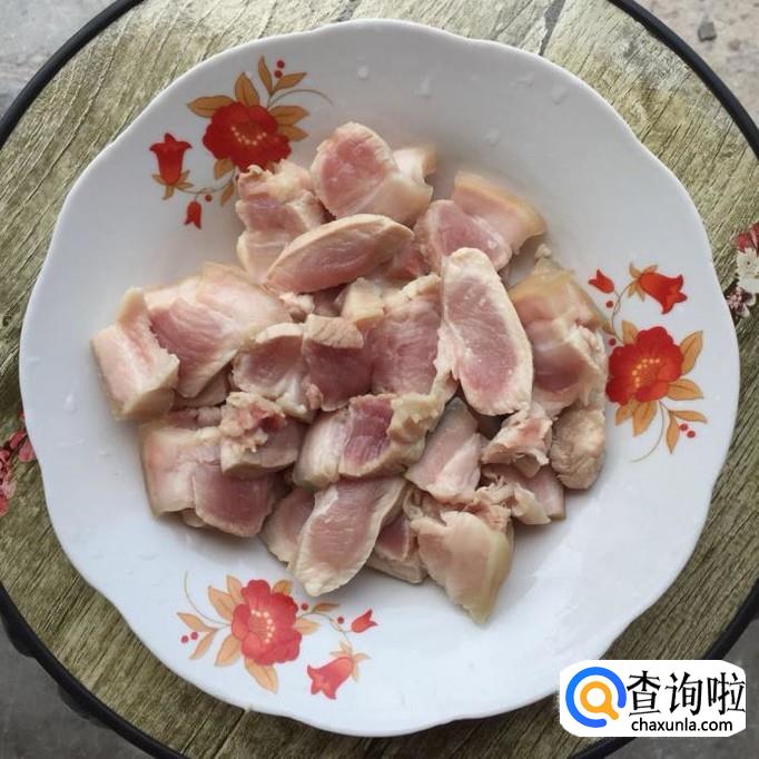 将五花肉洗净,整块放入锅里,加适量的水煮到五花肉表面变白、脏泡沫出,再捞出、洗净;然后切成薄片,备用;